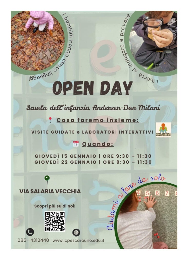 HomeOpen Day Scuola dell’Infanzia Don Milani-Andersen-Montessori Open Day Scuola dell’Infanzia Don Milani-Andersen-Montessori Tipologia Data: Gennaio 20, 2026 Invito agli Open Day di gennaio 2026 dell’Istituto Comprensivo Pescara 1 Nuovo Open Day Scuola Primaria “Rodari”